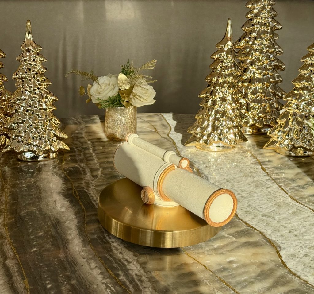 Et puis, au détour d’une table ornée de sapins scintillants, elle apparaît : la bûche. Tournoyant doucement sur elle-même avec grâce, teintée de blanc nacré et d’or. Une paire de lunettes d’observation, réplique fidèle de celles qui, quelques étages plus bas, invitent les visiteurs à scruter Paris. Comme un regard sur l’infini, témoins impassibles des saisons qui passent, des premières neiges aux étés brûlants.