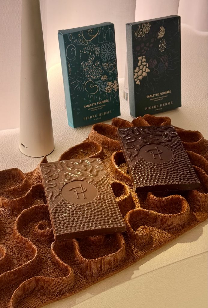 L’algue nori, audacieusement dosée, ouvre le chocolat vers de nouveaux territoires, équilibrée par la vivacité du gel yuzu, offrant une dégustation qui bouscule les codes et rééquilibrant l’ensemble par sa fraîcheur. Cette audace se retrouve également dans les bonbons de la collection où Pierre Hermé décline ses créations avec la même exigence et obsession du goût.