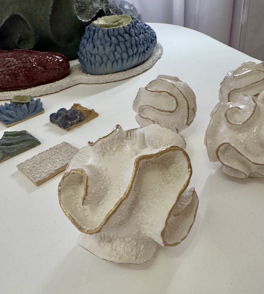 Courtney aurait très bien pu rester dans les laboratoires à faire de la recherche. Avec son diplôme de biologie marine de Skidmore College et son master en études environnementales de Brown University, toutes les portes de la recherche académique s’ouvraient à elle. Mais elle a compris très tôt que l’argile dirait mieux que les courbes et les chiffres ce qui se joue au fond des océans : “Je suis tombée amoureuse de l’océan très jeune, en grandissant à San Francisco”, me raconte-t-elle. Adolescente, elle sculptait déjà des créatures marines pour comprendre leur anatomie. Puis elle a compris que les récifs qu’elle aime se meurent. Elle a alors fait de son art une alerte. Ses installations monumentales demandent entre quatre et douze mois de travail. Dans son atelier de San Francisco, elle façonne chaque pièce en céramique à la main comme elle l’a fait, devant nous, lors de la présentation de Noël à Paris. Pourquoi la céramique ? Parce que ce matériau reflète la fragilité des coraux et rappelle leur composition naturelle en carbonate de calcium.