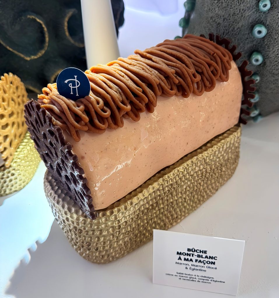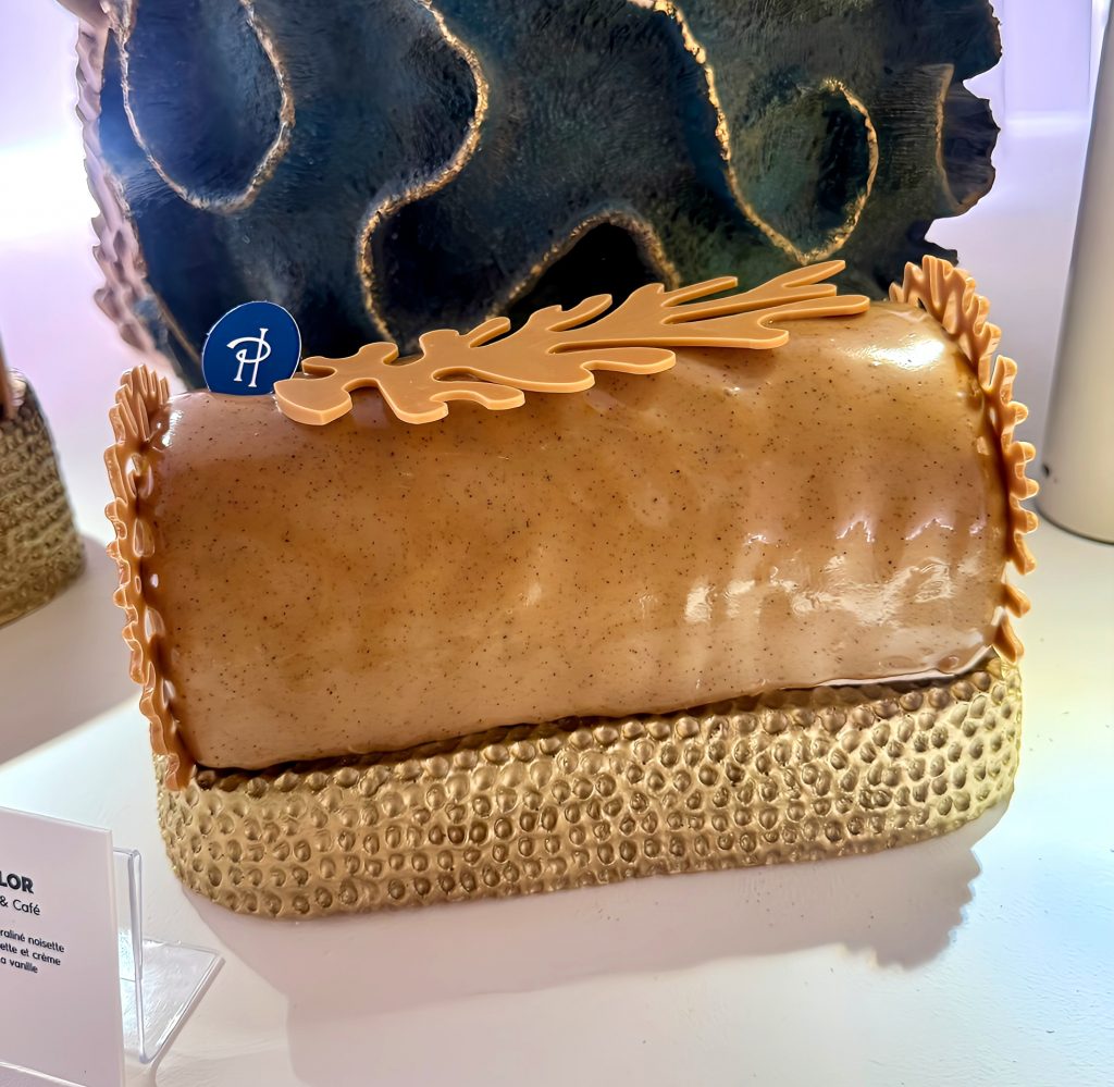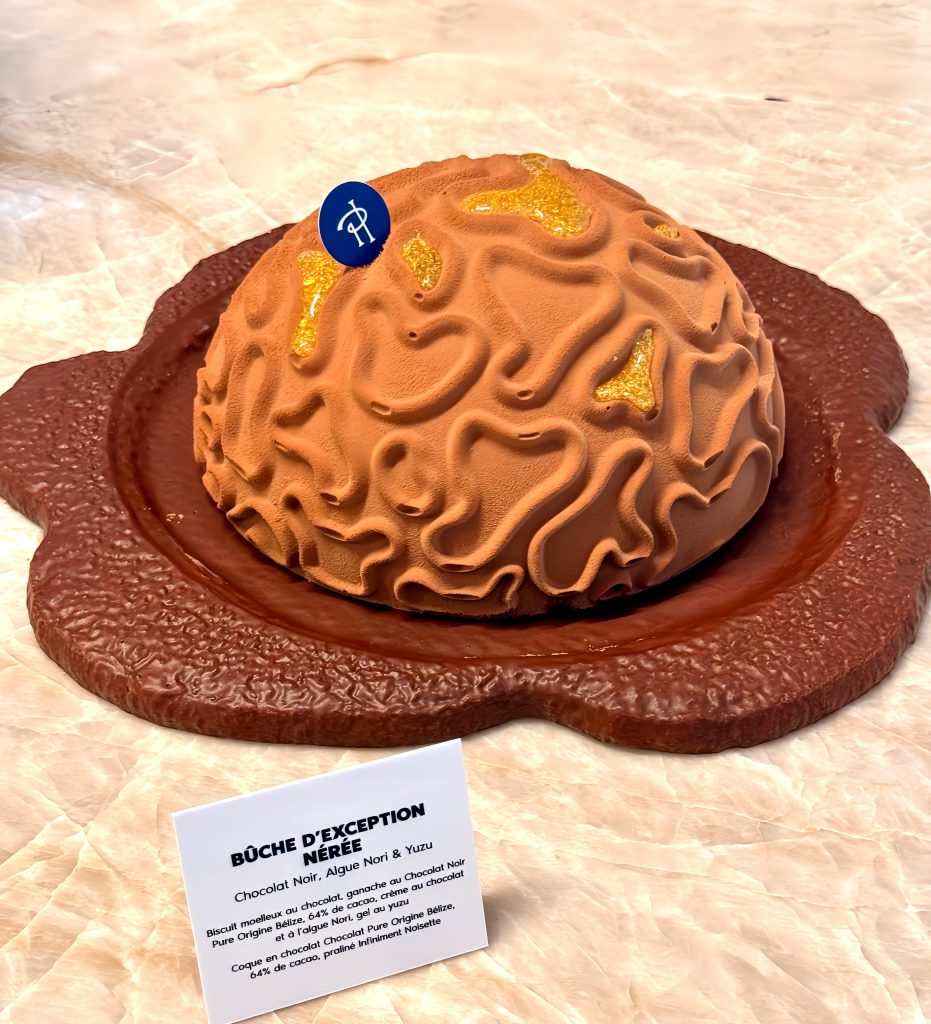 Cette année, Pierre Hermé n’a pas orné la bûche Ispahan ( rose/framboise/ leetchis) de framboises fraîches. Un choix judicieux ! Après plusieurs réflexions sur la saisonnalité, l’idée d’ajouter des framboises en plein hiver a été remise en question. À la place, un décor de corail couronne la création, faisant écho à la collection tout en respectant un engagement écologique plus cohérent.