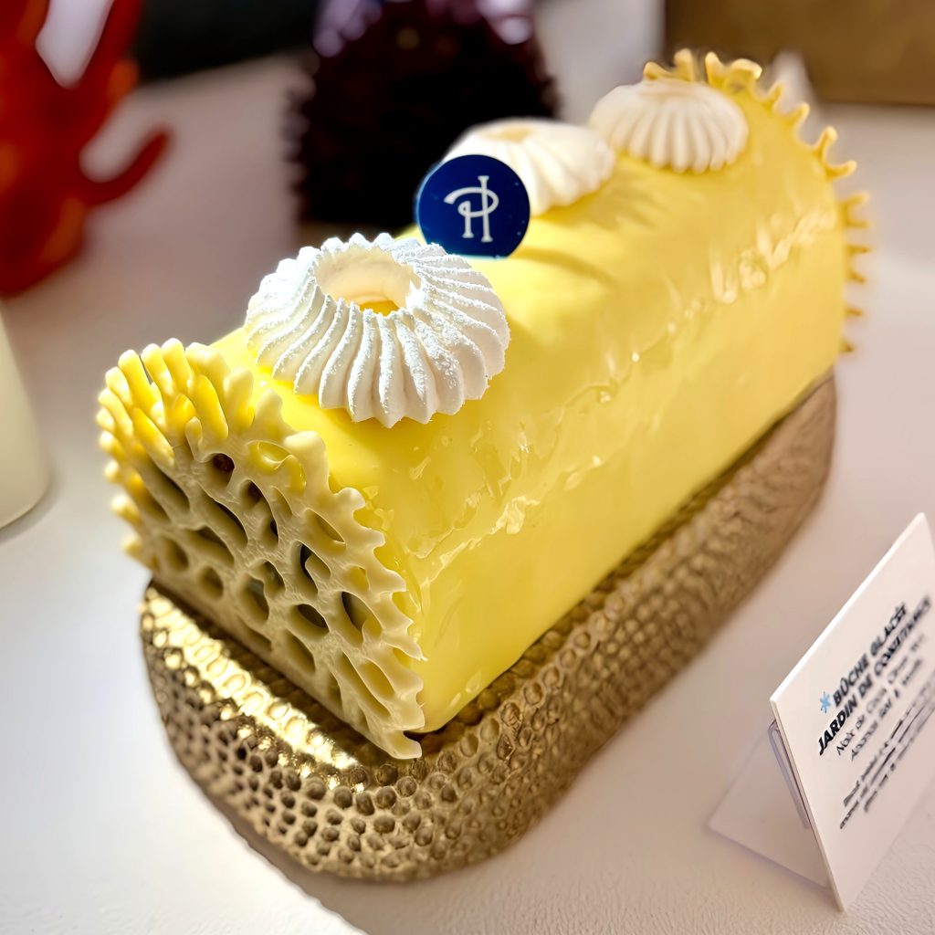 Il s’agit de la seule bûche glacée de la collection. Jardin de Constance ( 72 euros) est ornée de petites meringues en forme de coraux. Elle allie savamment noix de coco, vanille, citron vert et ananas rôti caramélisé. À l’intérieur, un sorbet ananas vanille, une glace coco citron vert avec un biscuit en dessous, imbibé à la vanille et au citron vert. Je ne l’ai pas goûtée mais vous trouverez tout le détail sur le site de la Maison Pierre Hermé Paris.
