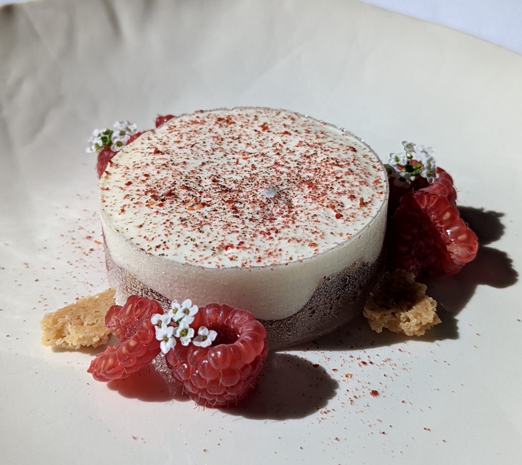 C’est là, dans cette maison historique, que j’ai découvert l’étendue de son talent. Son dessert poivron-framboise, assaisonné au piment du Béarn et au vinaigre de Lambrusco, m’avait bluffée. Il y avait dans cette association audacieuse cette recherche de profondeur, ce relief créé par l’acidité du vinaigre qui rehaussait la douceur du fruit et l’intensité du poivron. Il annonçait les prémices de sa signature car Jordan travaille les vinaigres avec intelligence : ils permettent de baisser le sucre d’au moins 20 à 30%, créant cet équilibre parfait entre fraîcheur et gourmandise.